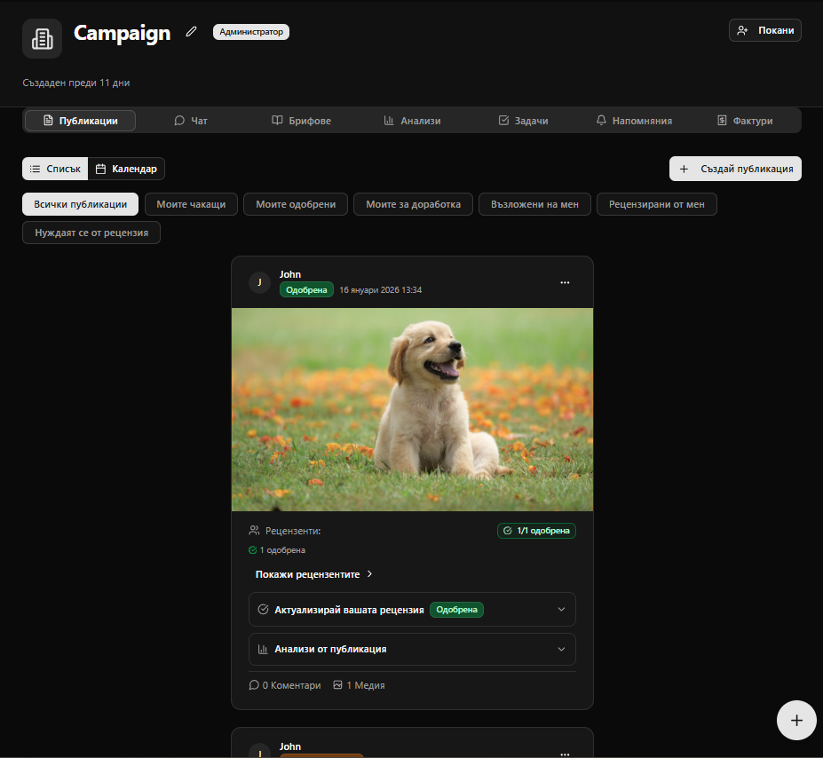 Подобри съдържанието си с един клик. AI асистентът генерира описанията на постове, задачи и напомняния, като се учи от твоя стил на писане и контекста на проектите. Работи на множество езици и адаптира съдържанието към специфичните клиенти и кампании.